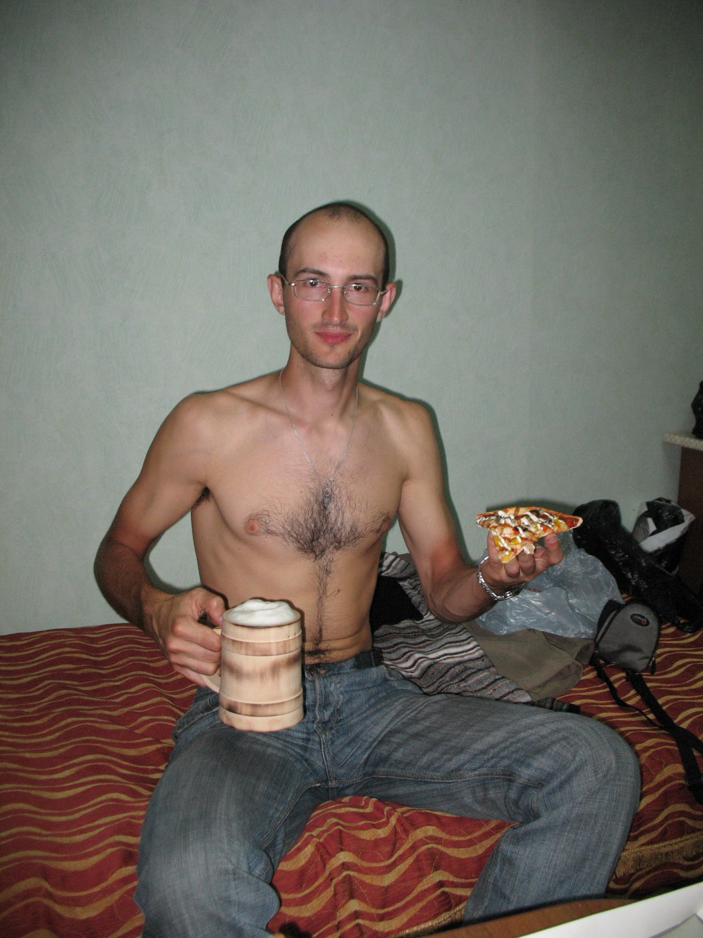 Скоро подъезжаем к Полоцку, километров за 5 видны многоэтажки, влетаем в него и едем в центр. Центр города очень похож на черниговский, есть та же аллея, да и дома все схожи. Ищем гостиницу, добираемся до самого центра города - фонтана. Я произношу фразу - что если на этой площади нет гостиницы, то типа съем свои перчатки. Гостиница оказывается в 20 метрах от нас. Спешиваемся, Рома идет переговариваться, заселяемся. Номер на двоих в этой гостинице нам обходится в 40 тысяч местных рублей, велосипеды паркуем на ресепшене. Идем осматривать вечерний город и искать, где что поесть. В итоге сходили в ресторан, потом взяли еще пиццу и местного пивка. Хорошо!